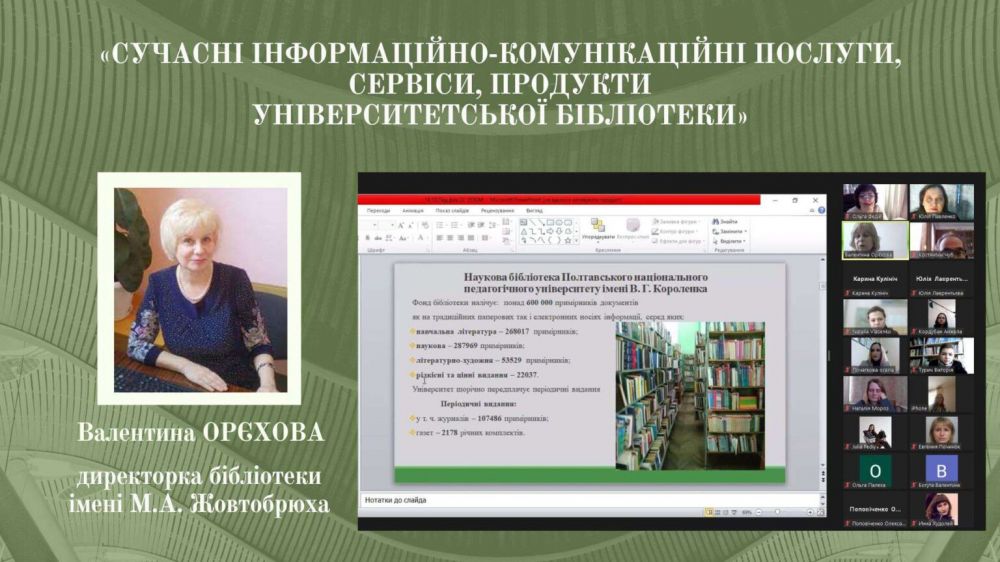 Під час лекції Валентина Володимирівна ознайомила студентів з широким колом питань, а саме: структурою бібліотеки, вебсайтом книгозбірні, інституційним репозитарієм. Також були з’ясовані особливості надання бібліотечних послуг у режимах офлайн і онлайн, правила оформлення списку джерел та літератури в наукових працях і публікаціях згідно із сучасними вимогами. Особливу увагу лекторка приділила питанням формування культури академічної доброчесності здобувачів вищої освіти відповідно до «Положенням про запобігання та виявлення академічного плагіату в ПНПУ імені В. Г. Короленка». Зокрема, Валентина Володимирівна розкрила зміст основних понять, що узгоджуються з академічною доброчесністю, й детально пояснила правила проходження перевірки текстів наукових робіт на антиплагіатних автоматизованих системах Unicheck та Strike Plagiariusm.
