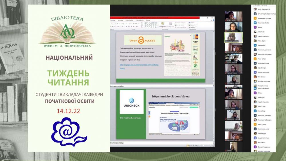 Кафедра початкової освіти долучилася до проведення Національного тижня читання, що триває в Україні з 12 до 19 грудня. Так, 14 грудня 2022 р. за ініціативи завідувачки кафедри професорки Ольги Федій студенти спеціальності 013 Початкова освіта 1, 2, 3 рівнів вищої освіти й викладачі взяли участь в інтерактивній онлайн-лекції на тему «Сучасні інформаційно-комунікаційні послуги, сервіси, продукти університетської бібліотеки». Лекцію читала директорка бібліотеки імені М. А. Жовтобрюха, заступниця голови Комісії з академічної доброчесності ПНПУ імені В.Г. Короленка Валентина Орєхова.
