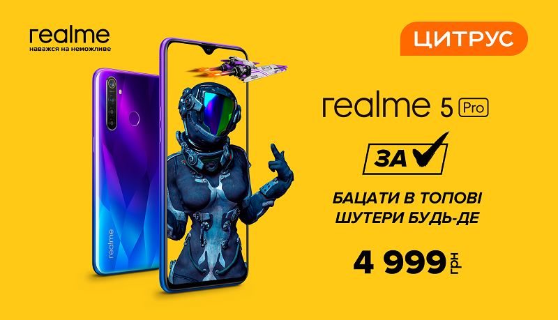 Для того щоб зробити знайомство з брендом ще приємніше в період 04.03 - 08.03 в магазині Цитрус буде діяти супер-ціна на realme 5 Pro - 4999 грн, замість 5499 грн.